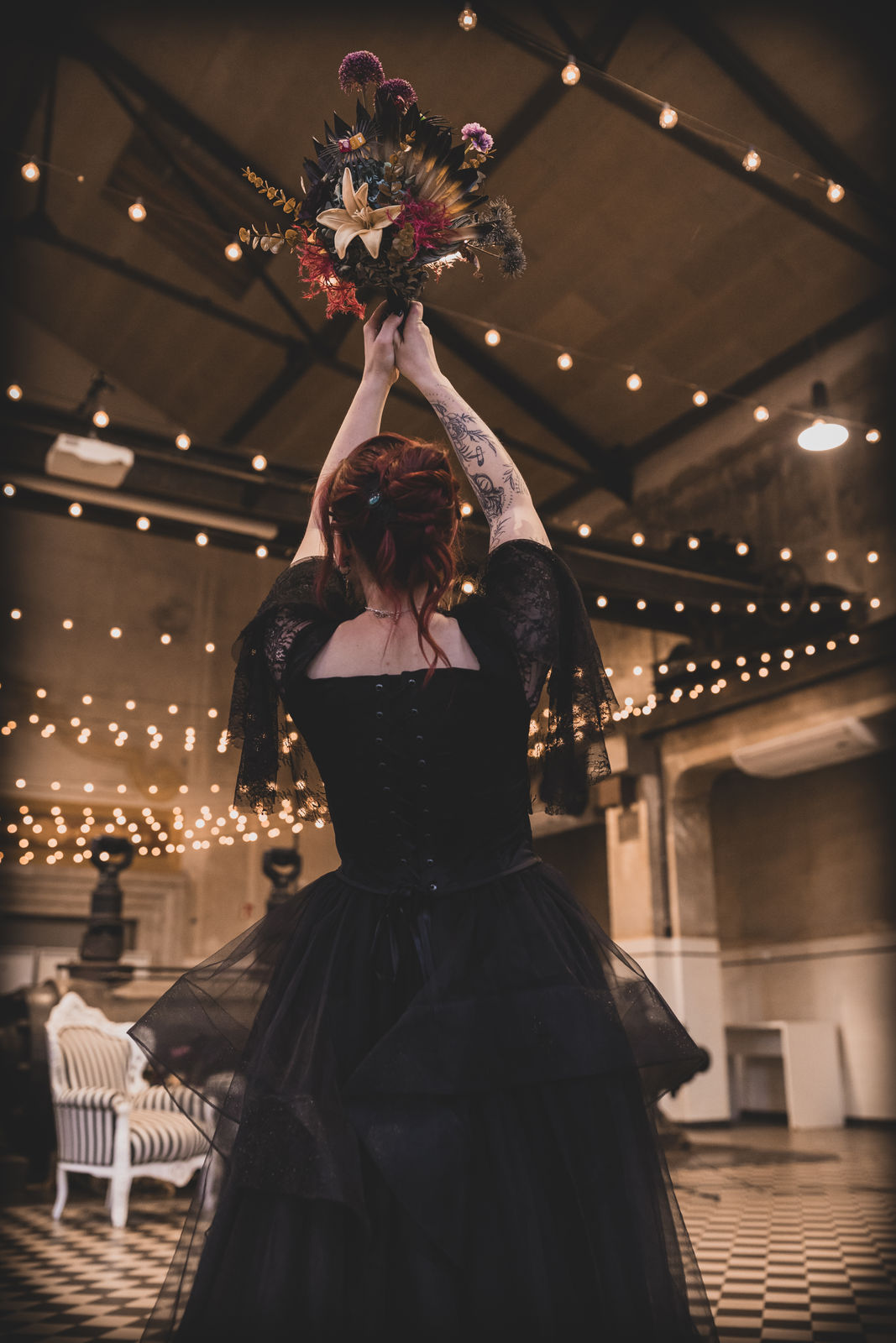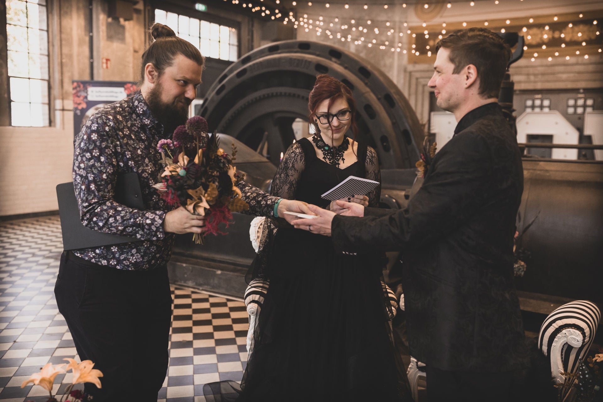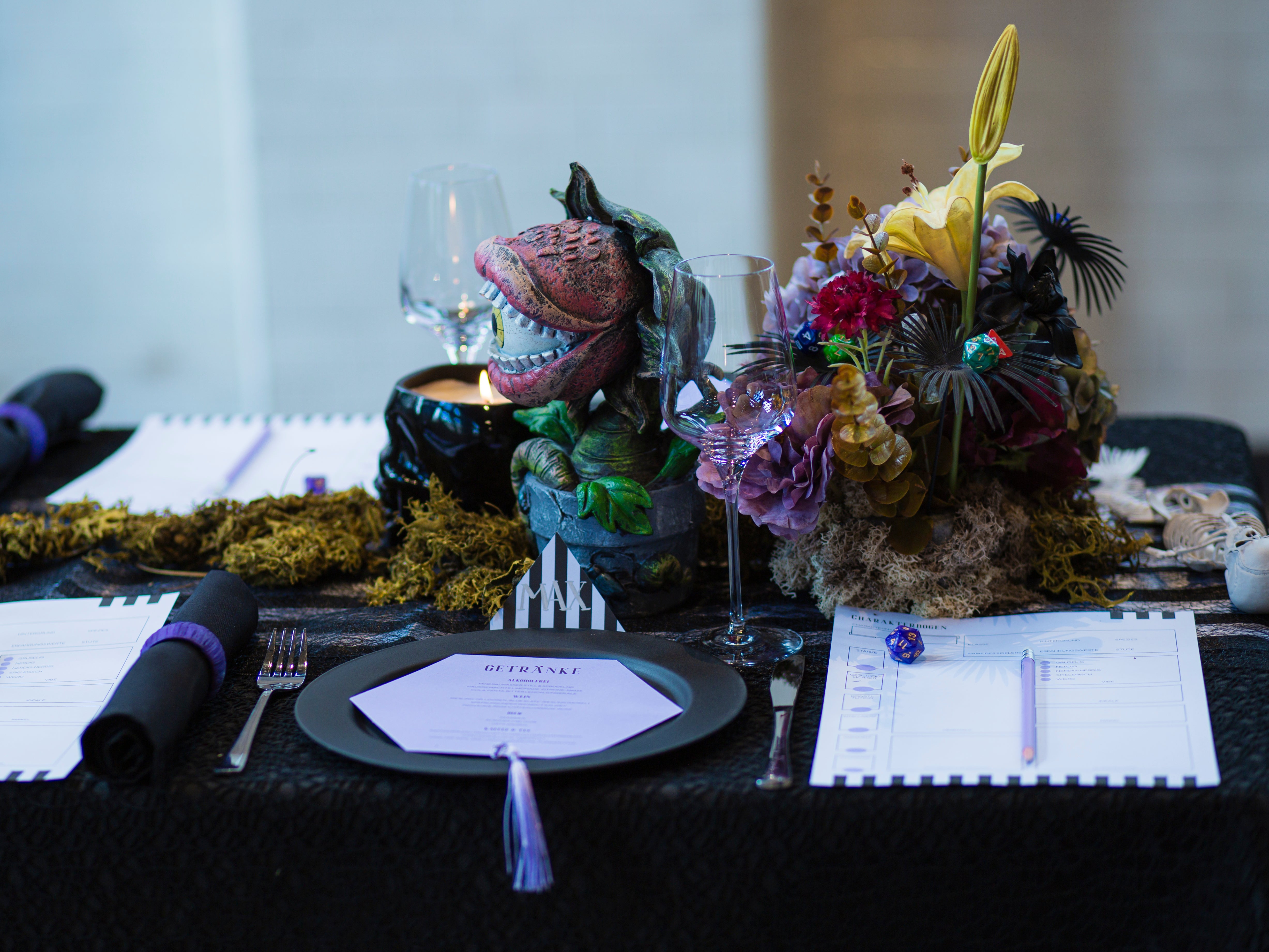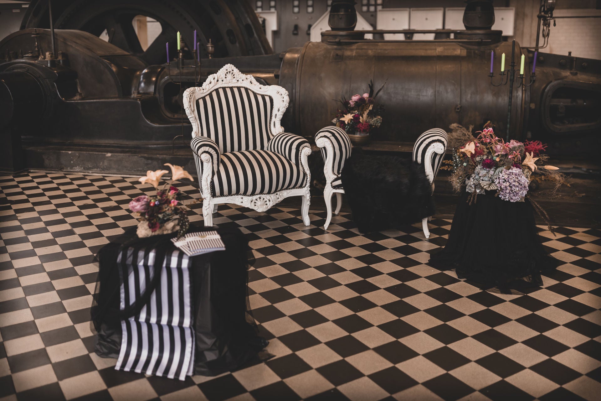 Die Alte Maschinenhalle bildete die perfekte Kulisse: edel, verspielt & voller Atmosphäre. Zwischen dunklen Stoffen, floraler Opulenz und Kerzenschein kam unser handgefertigter Gothic Schmuck besonders schön zur Geltung.