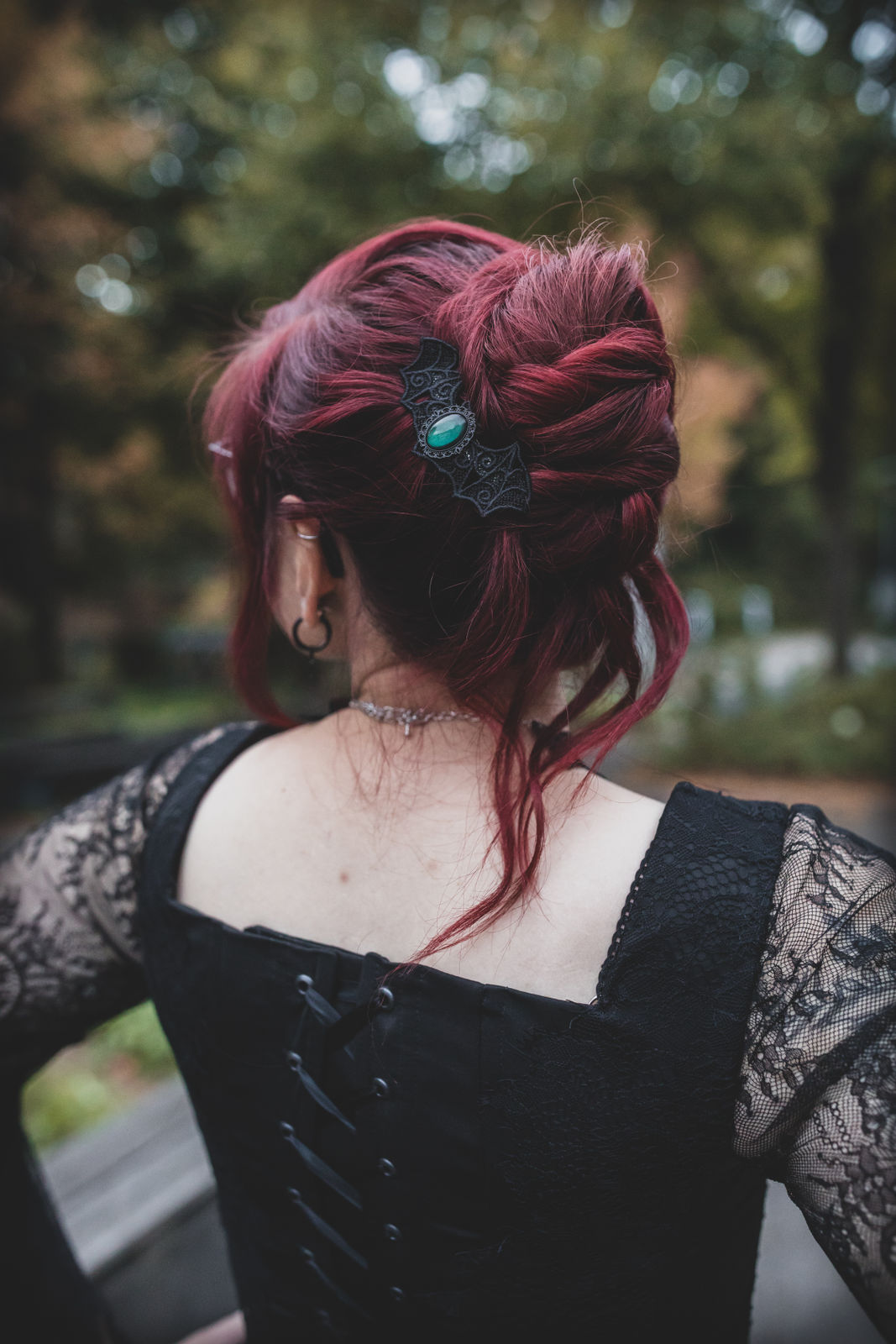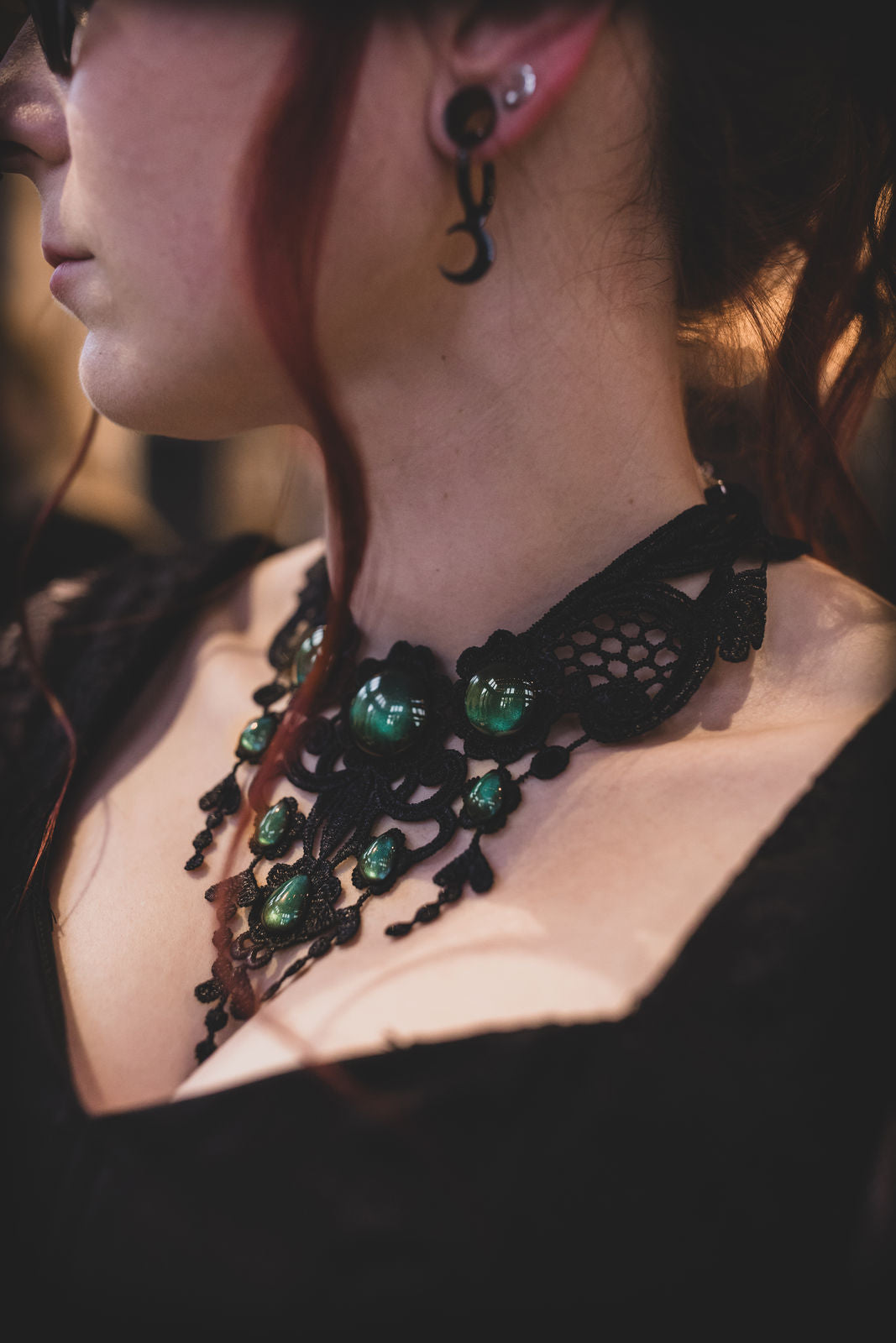 Wenn du es zarter magst, ist ein Choker mit feiner Posamentborte, funkelnden Steinen oder einem Mond-Anhänger die perfekte Wahl. Beide Varianten lassen sich farblich an euer Konzept anpassen – ob Schwarz, Silber oder dunkles Rot.