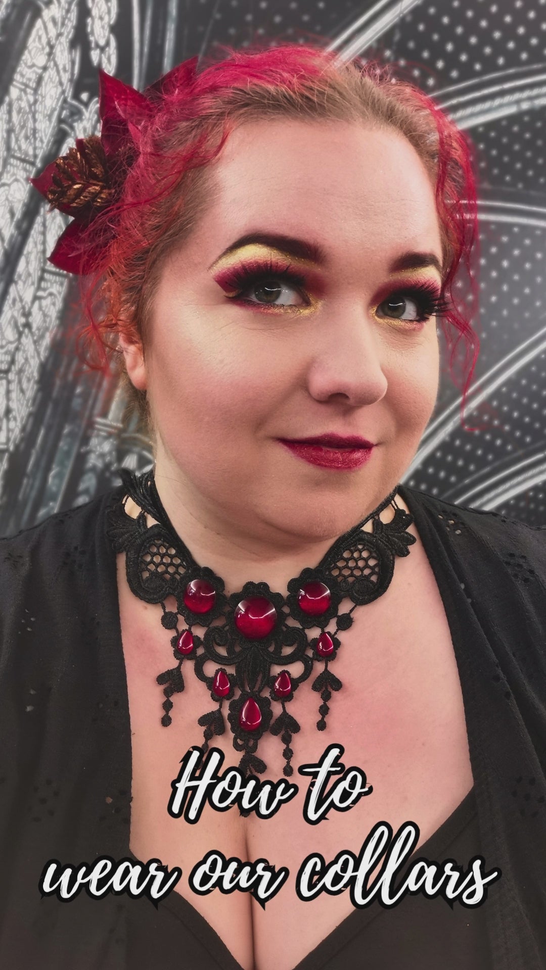Verspieltes Gothic Collier aus Spitze in schwarz mit farbigen Cabochon Glassteinen. Das kleine Collier besticht durch edles Understatement.